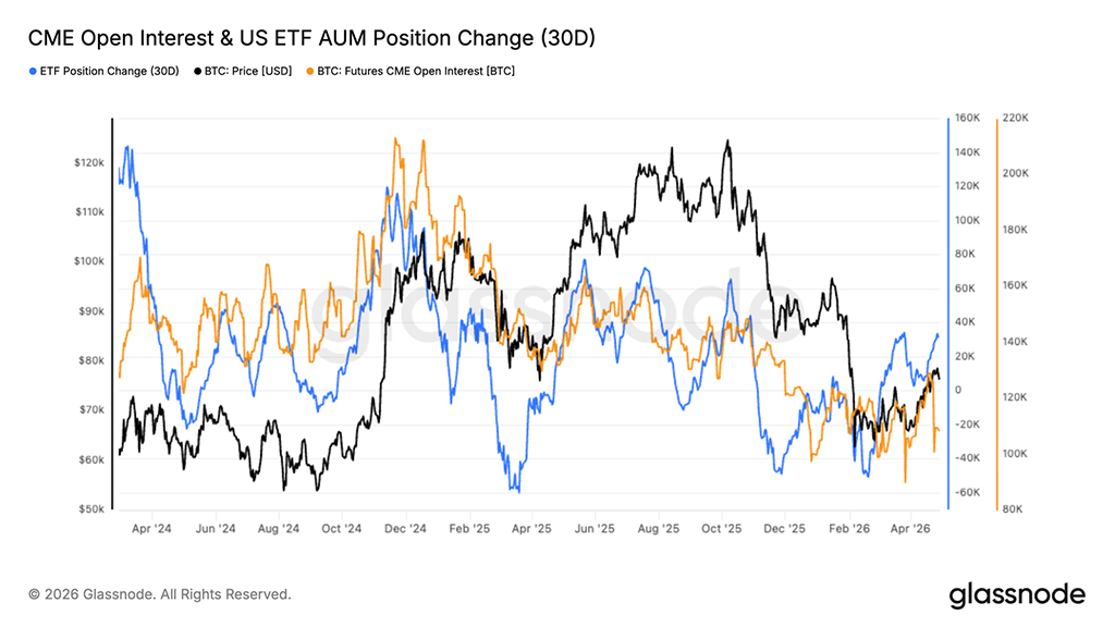 - Институциональные потоки стабилизируются, поскольку объем активов под управлением ETF восстанавливается, а открытый интерес на CME начинает формироваться после периода устойчивого оттока средств.