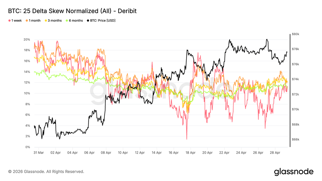В последнее время, по мере приближения цены к уровню сопротивления $80000, спрос на пут-опционы снова возрос, что смещает асимметрию в сторону диапазона 11-12 процентов по всем срокам погашения. Защита сохраняется, рынок тактически корректируется в краткосрочной перспективе, сохраняя при этом осторожную позицию на более поздних этапах кривой доходности.