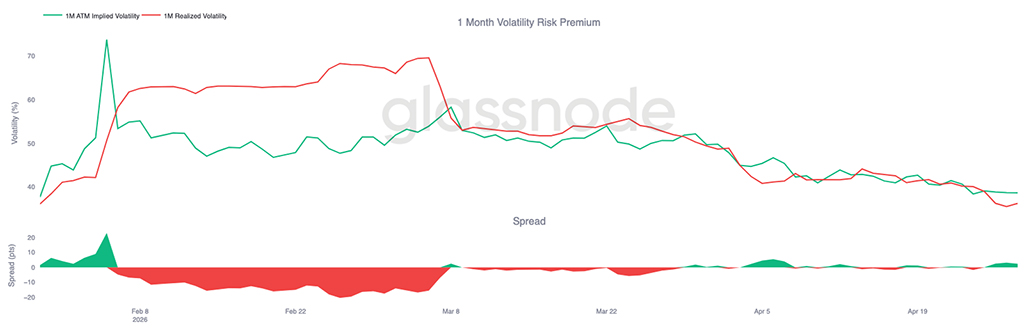 Поскольку подразумеваемая волатильность продолжает снижаться, реализованная волатильность движется в том же направлении, усиливая тенденцию. В случае с BTC наблюдается устойчивое снижение реализованной волатильности. Такое совпадение подразумеваемой и реализованной волатильности имеет важное значение, поскольку снижает необходимость в существенной премии за волатильность для компенсации неопределенности.
