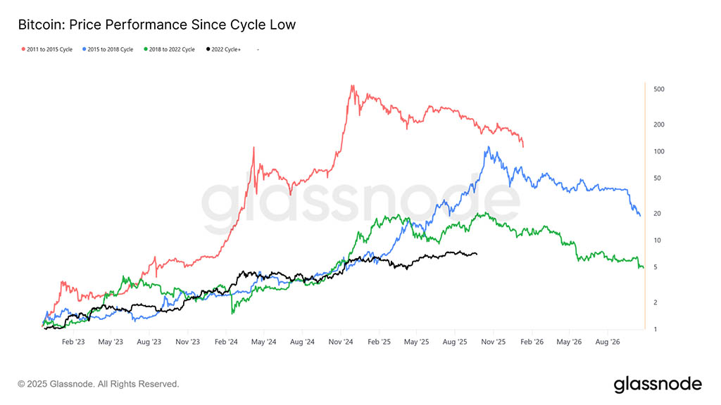 Расширяя обзор, накладывая друг на друга последние четыре цикла, можно увидеть, как пиковая доходность со временем снижалась, несмотря на то, что текущая траектория остаётся близкой к двум предыдущим циклам. Если предположить, что глобальный пик был зафиксирован на уровне $124000, то этот цикл длился примерно 1030 дней, что очень близко к продолжительности двух предыдущих циклов (около 1060 дней).