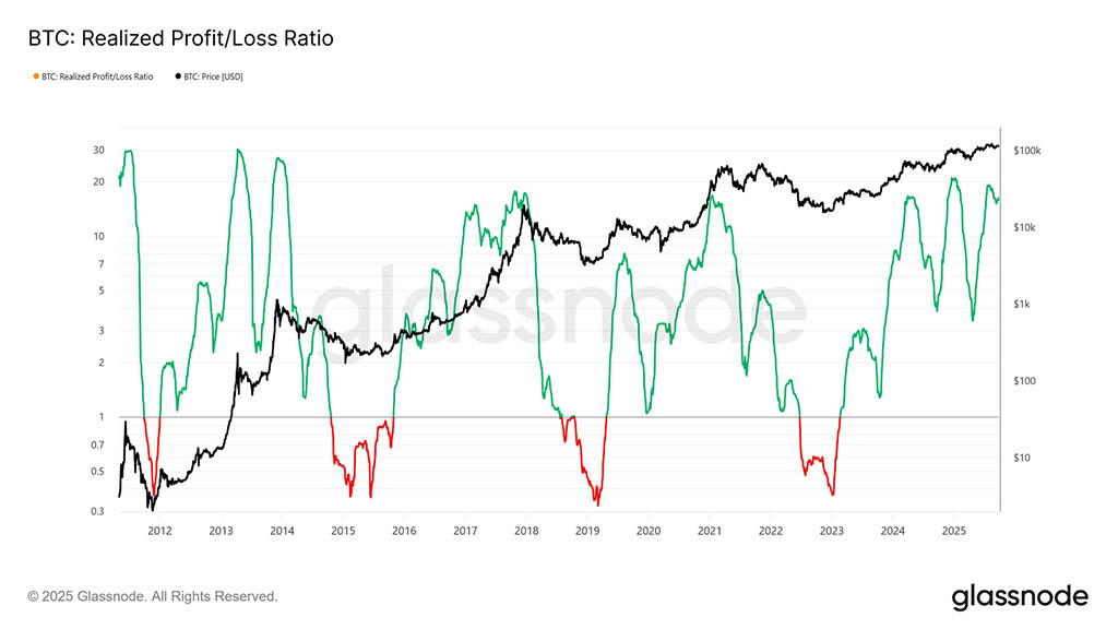 Исходя из этого, текущее падение с максимума в $124000 до $113700 составляет всего 8%, что незначительно по сравнению с падением на 28% в текущем цикле или падением на 60% в предыдущих циклах. Это соответствует долгосрочной тенденции к снижению волатильности как в рамках макроциклов, так и внутри циклов, напоминая устойчивый рост 2015–2017 годов, пока без резкого спада на поздней стадии.