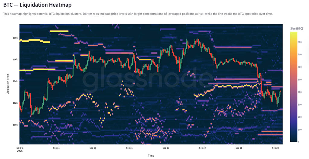 Тепловые карты непрерывной ликвидации добавляют ярких красок. Когда цена пробила отметку $114000–$112000, плотные скопления длинных позиций с кредитным плечом были уничтожены, что привело к масштабным ликвидациям и ускорению падения. Зоны риска остаются выше $117000, что делает обе стороны рынка уязвимыми к колебаниям, вызванным ликвидностью. Без роста спроса нестабильность вблизи этих уровней увеличивает риск дальнейших резких движений.
