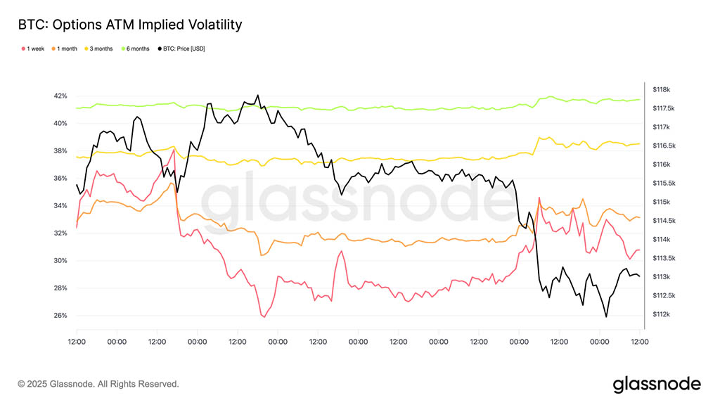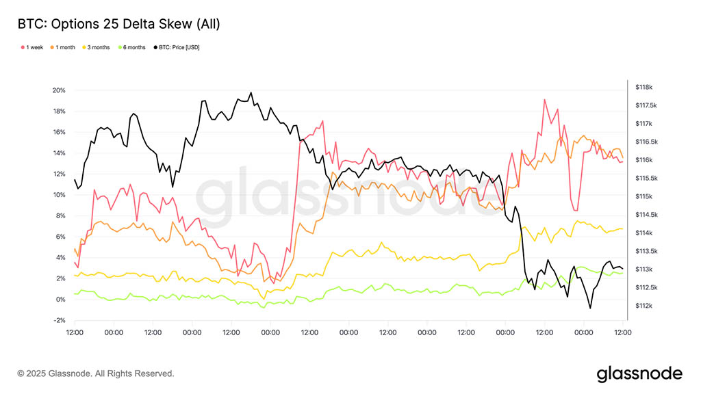 После распродажи соотношение объёмов пут/колл снизилось, поскольку трейдеры фиксировали прибыль по путам «в деньгах», а остальные перешли на более дешёвые колл. Перекос подкрепляет эту картину: краткосрочные и среднесрочные опционы по-прежнему сильно склоняются к путам, что делает защиту от снижения цены дорогой по сравнению с защитой от роста. Для участников с конструктивным взглядом на конец года этот дисбаланс создаёт возможности — либо накапливая колл-опционы по относительно низкой цене, либо финансируя их за счёт продажи высоко оцененных позиций, подверженных снижению цены.