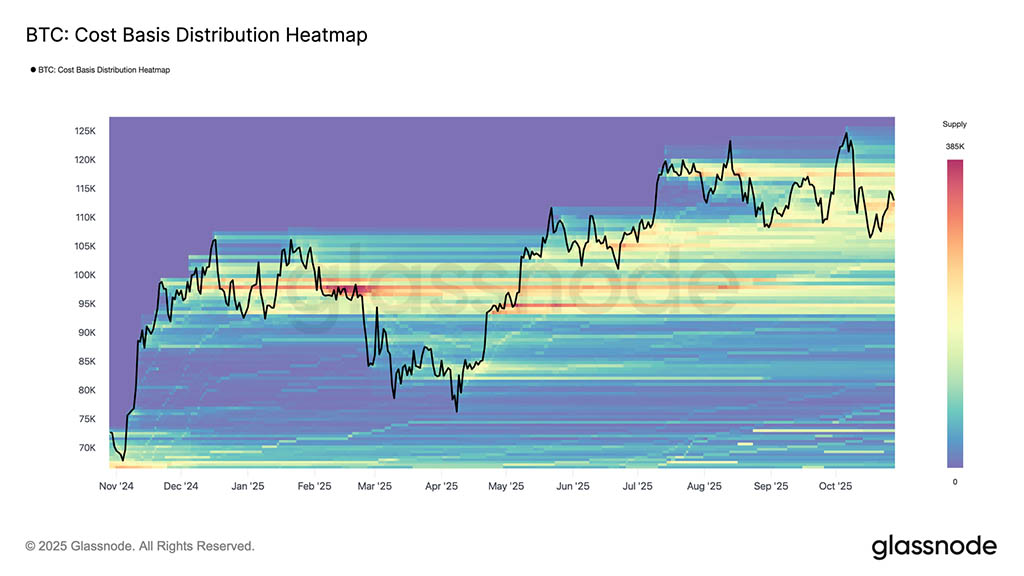 На выходных биткоин продемонстрировал кратковременное восстановление после непродолжительного падения к нижней границе кластера предложения крупнейших покупателей, охватывающего диапазон $107000–$118000. Согласно тепловой карте распределения стоимости, цена отскочила от средней линии вблизи $116000, прежде чем вернуться к отметке около $113000.