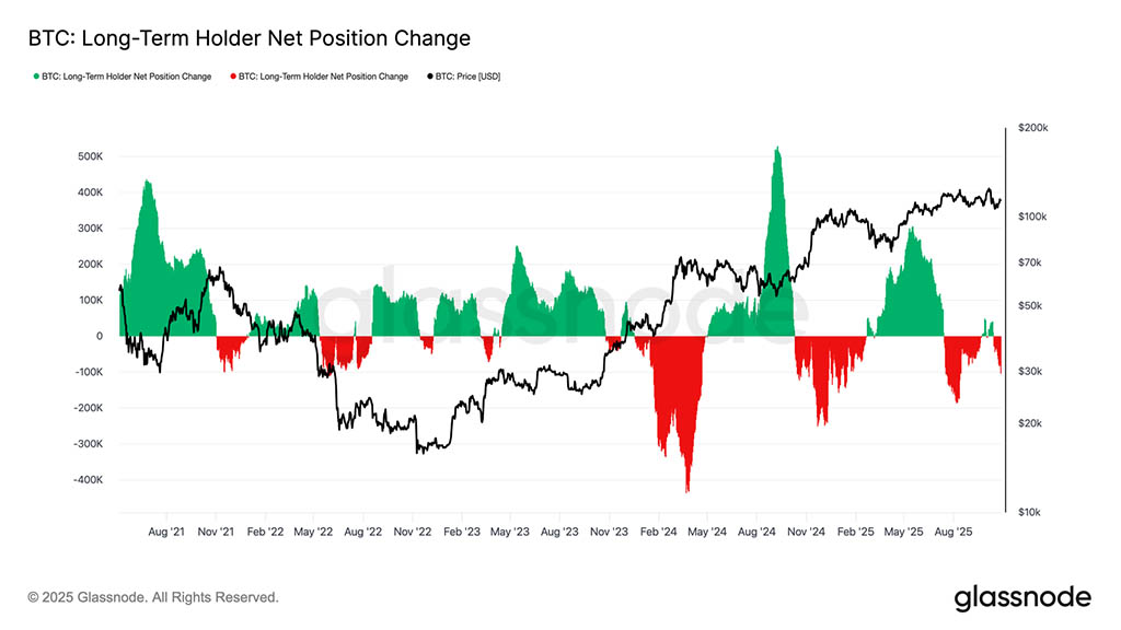 Судя по предыдущим наблюдениям, постоянные продажи со стороны долгосрочных держателей (LTH) продолжают оказывать давление на структуру рынка. Изменение чистой позиции долгосрочных держателей снизилось до –104 тыс. BTC в месяц, что свидетельствует о самой значительной волне распределения с середины июля.