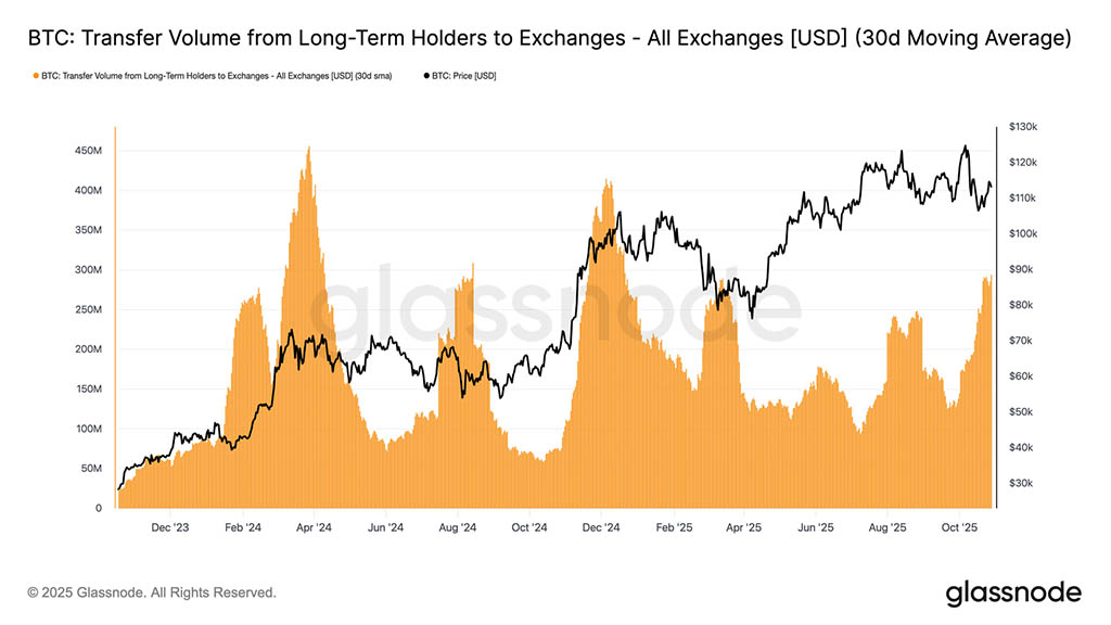 Чтобы оценить интенсивность продаж долгосрочных держателей, можно обратиться к показателю объёма переводов из LTH на биржи (30D-SMA), который отражает стоимость монет, переведённых опытными инвесторами для потенциальной продажи. Этот показатель вырос примерно до $293 млн. в день, что более чем вдвое превышает базовый уровень в $100–125 млн, наблюдавшийся с ноября 2024 года.