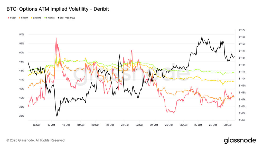 Переходя к рынку опционов, последние данные показывают, что стресс от волатильности, вызванный обвалом 10 октября, продолжает ослабевать. 30-дневная реализованная волатильность биткоина снизилась до 42,6%, что немного ниже 44% на прошлой неделе, что отражает более спокойную динамику цен. Между тем, подразумеваемая волатильность, отражающая ожидания трейдеров, снизилась ещё сильнее, поскольку участники сворачивают хеджирование снижения и снижают спрос на защиту.