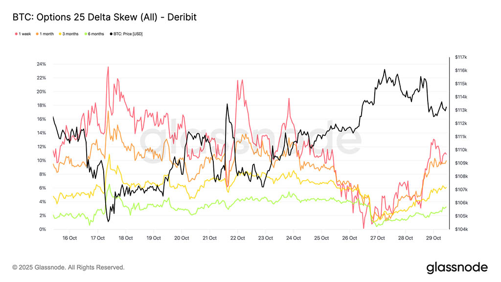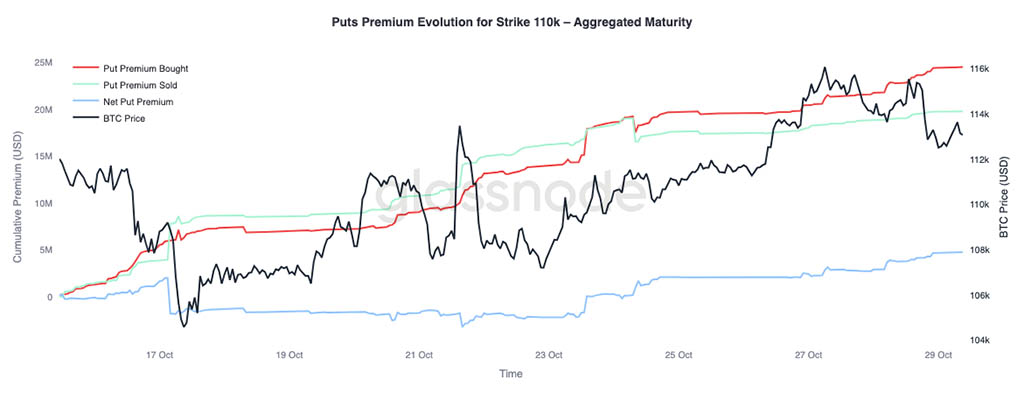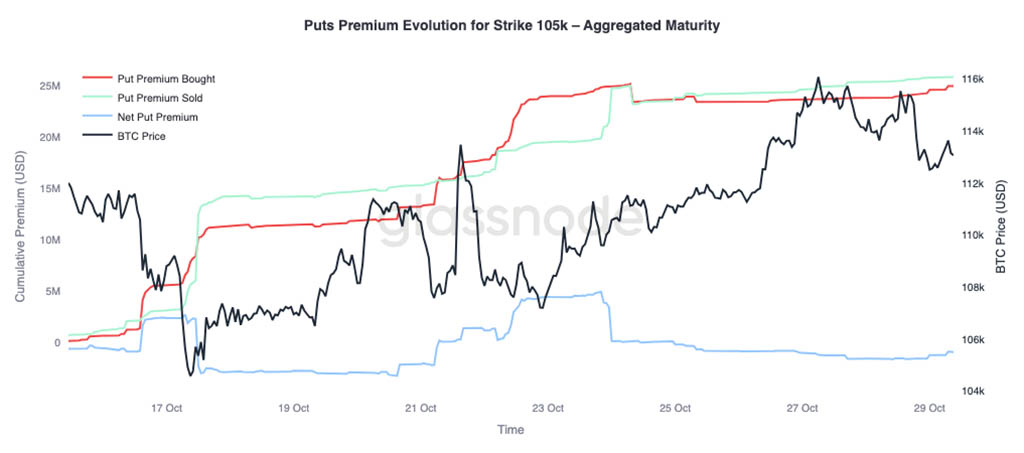 Чтобы дополнить картину, можно обратиться к рынку пут-опционов. С 24 октября трейдеры покупали пут-опционы на $110000 на фоне роста биткоина, что сигнализирует о спросе на краткосрочную защиту от падения. В то же время, пут-опционы на $105000 продавались активнее, что говорит о том, что участники готовы получать премии, страхуя более высокие страйки.