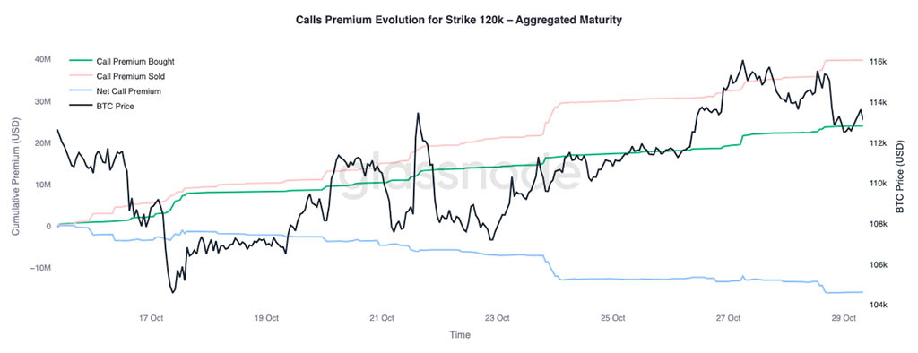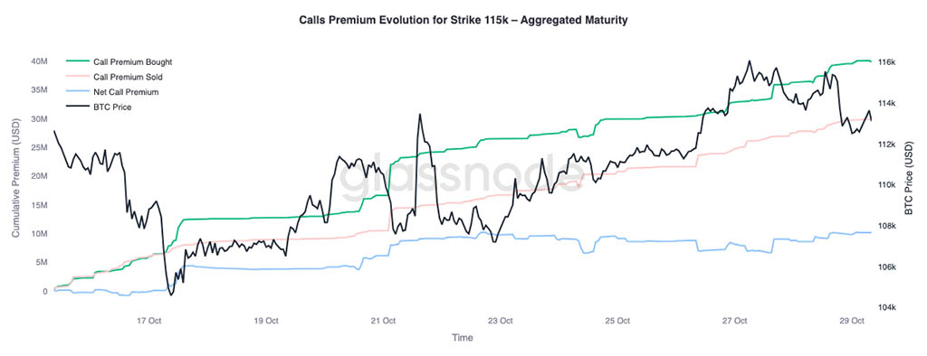 С нормализацией перекоса внимание переключается на то, куда трейдеры распределяют премию. Активность опционов колл теперь заметно варьируется в зависимости от страйка. При страйке $115000 чистая купленная премия по опционам колл остаётся положительной, что указывает на то, что трейдеры стабильно платили за краткосрочный рост, поскольку цена восстанавливалась в течение последних двух недель. Напротив, при страйке $120000 проданные премии по опционам колл превысили покупки, что привело к отрицательной чистой премии.
