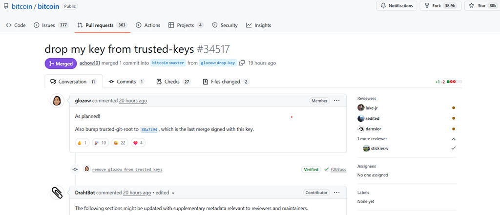 В четверг Чжао отправила свой последний запрос на слияние в репозиторий Bitcoin на GitHub, удалив свой ключ из списка доверенных ключей и выйдя из числа немногих сопровождающих, имеющих право обновлять программное обеспечение Bitcoin.