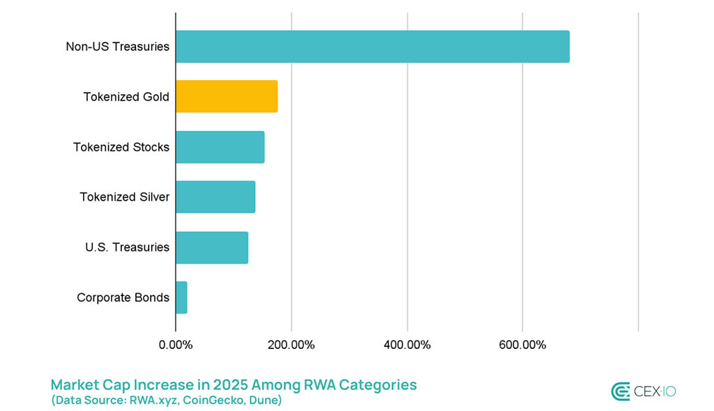 Согласно данным, собранным Cex.io на основе общедоступных блокчейн-источников и рыночных данных, рыночная капитализация токенизированного золота за последний год выросла на 177%, а число держателей увеличилось почти втрое: за год было добавлено более 115 000 новых кошельков, что опережает большинство других категорий активов реального мира (RWA).