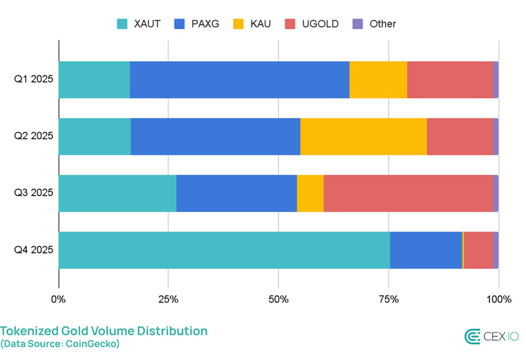 Значительная часть резкого роста в конце года была обусловлена Tether Gold (XAUT), на долю которого в четвертом квартале пришлось 75% от общего объема торгов, что значительно больше, чем 27% в третьем квартале. Согласно информации на сайте компании Tether, рыночная капитализация XAUT составляет $2,42 миллиарда, а в качестве обеспечения используются 1329 золотых слитков, или около 16 239 килограммов физического золота.