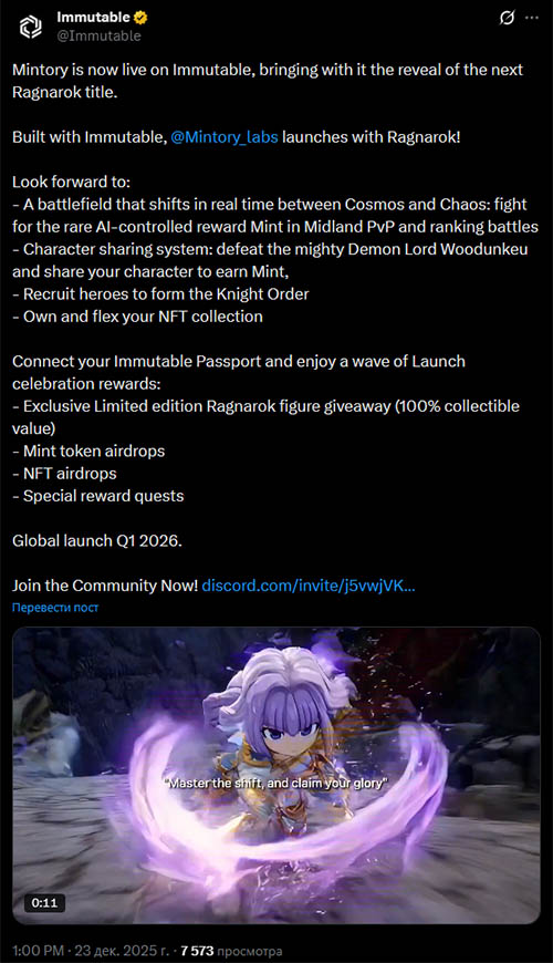 Компания Immutable добавила еще одну игру в свою растущую линейку web3-игр. Во вторник компания подтвердила, что NFT-игра Ragnarok: Sharing Hero теперь доступна в Immutable Play. В анонсе также представлено Mintory, новое игровое сообщество web3, призванное связать цифровые активы с социальным игровым процессом.