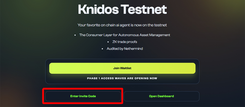 1. Перейдите на страницу Knidos Testnet, нажмите «Enter Invite Code» и введите пригласительный код.