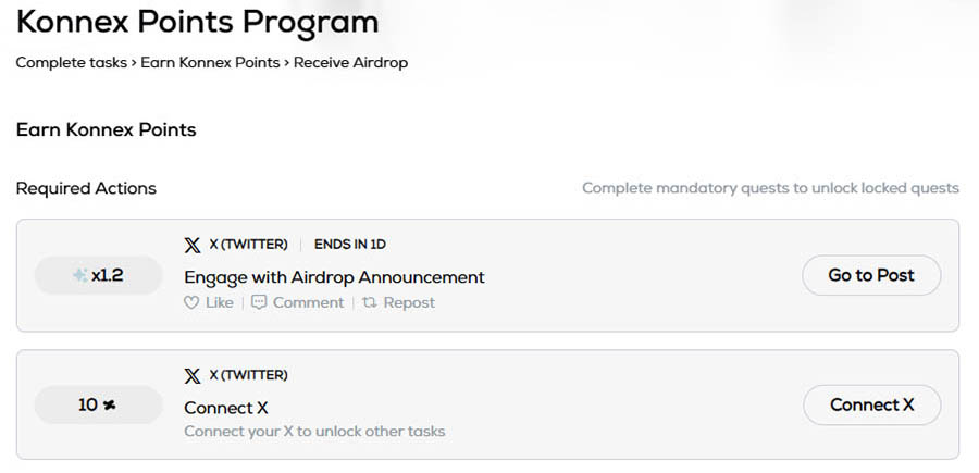 ИИ-проект Konnex запустил кампанию Konnex Points Program, в которой пользователи могут выполнять простые социальные задания и зарабатывать поинты. Проект подтвердил аирдроп токенов KNX, которые будут распределены между участниками кампании в зависимости от их активности. Кампания была запущена 20 января и находится на самом раннем этапе.