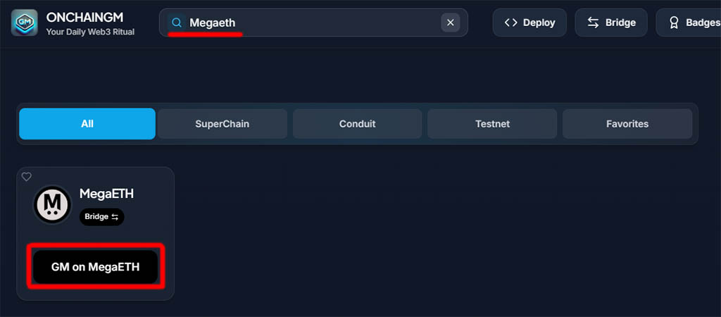 3. Отправьте сообщение GM в блокчейн MegaETH на платформе Onchaingm (стоимость: $0.06):