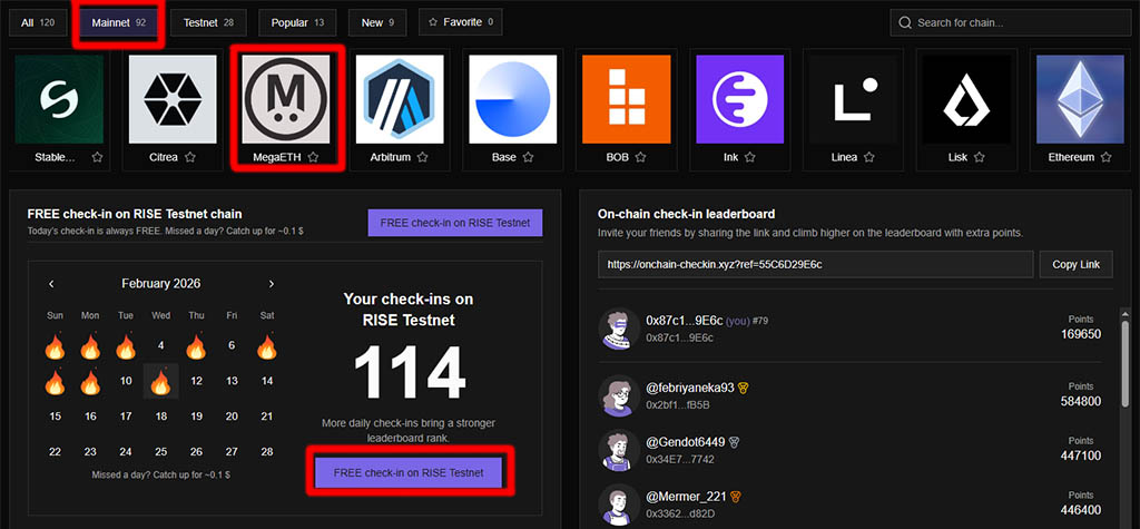 4. Совершайте ежедневные бесплатные транзакции Check-In на платформе On-Chain Check-In: