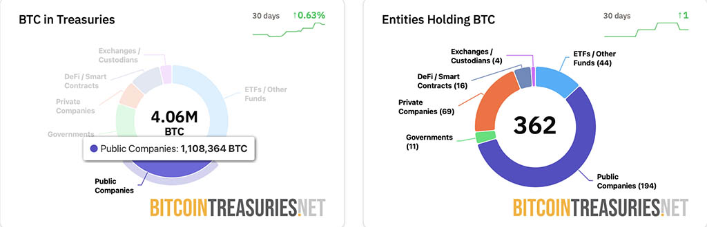 На момент публикации публично котируемые компании совместно владели примерно 1,1 миллионами BTC, что составляет около 5,5% от 19,97 миллионов BTC, находящихся в обращении.