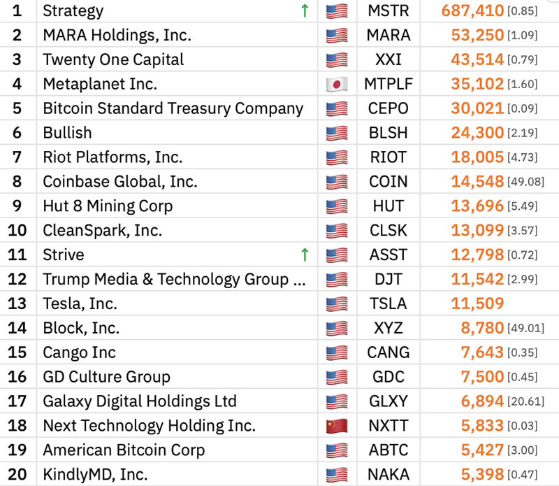 Однако корпоративная собственность по-прежнему сильно сконцентрирована: на балансе MARA Holdings числится 53 250 BTC, а Twenty One Capital — 43 514 BTC, уступая по этому показателю только Strategy.