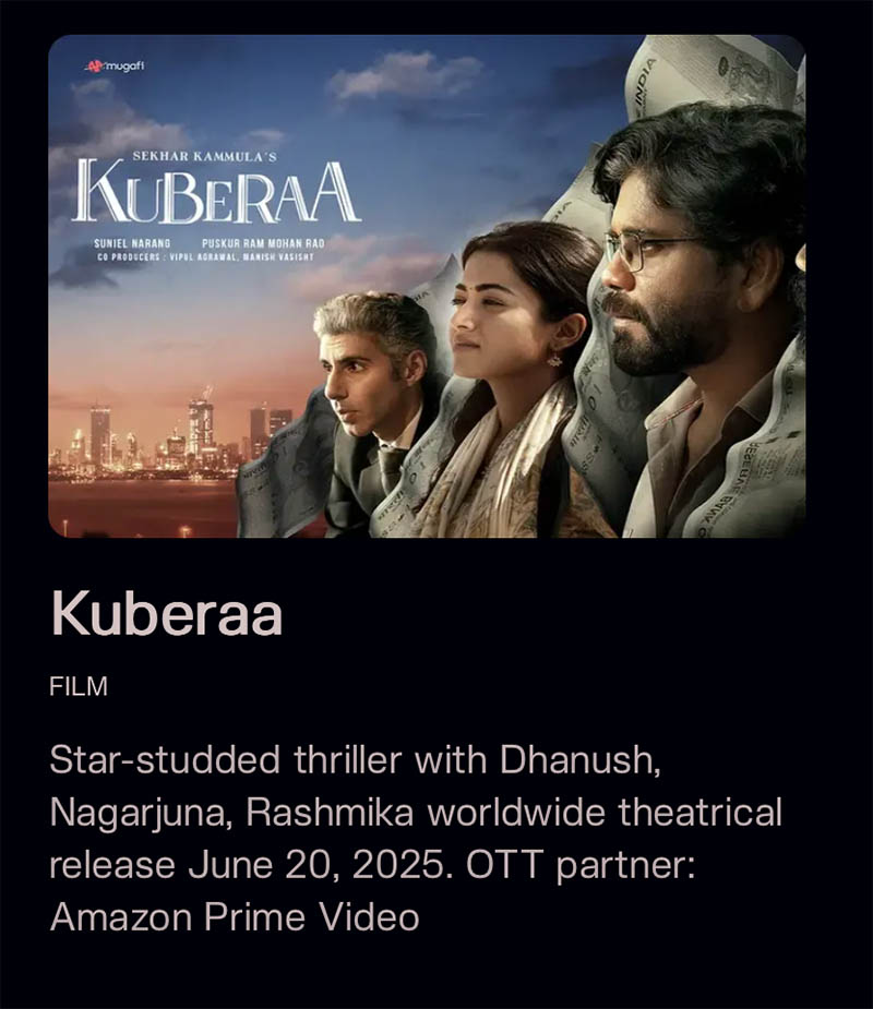 Фильм «Мугафи», запущенный в 2020 году в Индии, финансируется несколькими инвесторами в индустрию развлечений и венчурным капиталом, включая Nexus VP, HashedEM, Netflix, Amazon и Panorama Studios. Фильм «Кубераа», который выйдет в прокат в 2025 году, собрал $35 миллионов и распространялся через Amazon Prime Video.