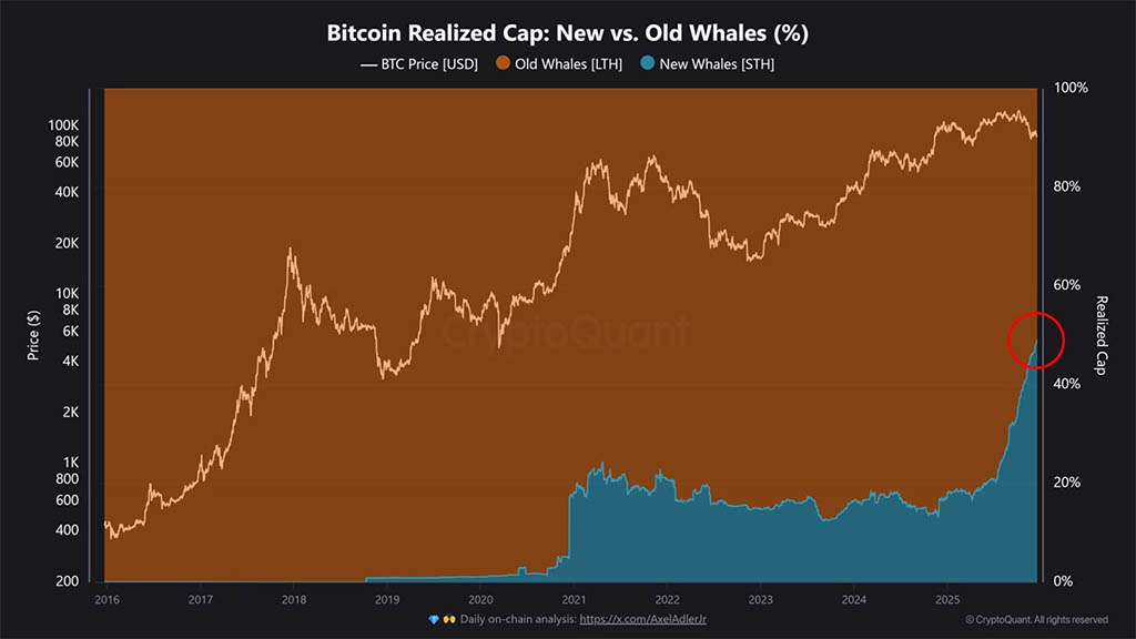 Данные CryptoQuant показывают, что адреса, классифицированные как новые крупные держатели (киты), теперь составляют почти 50% от реализованной капитализации биткоина. Реализованная капитализация измеряет стоимость BTC по цене, по которой цена каждой монеты в последний раз менялась, то есть это изменение отражает то, куда капитал поступил в сеть, а не то, кто владеет наибольшим количеством монет.