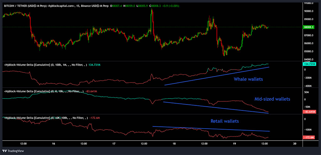 Данные Hyblock подтверждают эту точку зрения. Кумулятивная дельты объема покупателей (CVD), отражающая доминирование покупателей и продавцов, демонстрирует, что объемы операций с крупными суммами (от $100 000 до $10 миллионов) на этой неделе выросли на $135 миллионов.