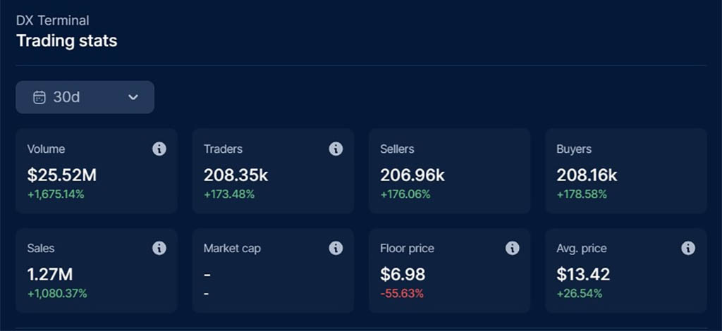 Тем временем, по данным DappRadar, DX Terminal компании Base занял четвертое место по объему торгов с показателем $25,5 млн, продемонстрировав рост почти на 1700%.