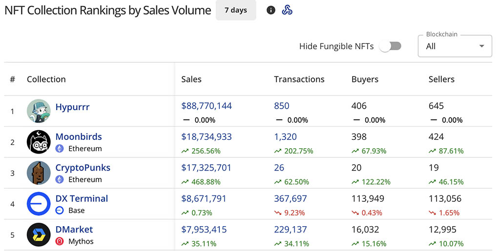 Коллекция Hypurrr NFT оказалась лидером продаж на этой неделе, показав объем торгов в $88,77 млн. за 850 транзакций.