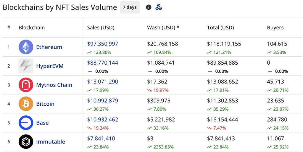 Ethereum сохранил свои позиции лидера среди блокчейнов по объему продаж NFT, зафиксировав объем в $97,4 млн, что на 124,35% больше, чем $28,3 млн на прошлой неделе.