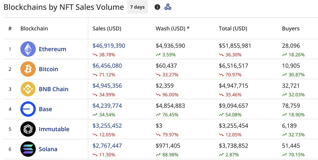 Bitcoin понес самое резкое падение среди основных блокчейнов, заняв второе место с объемом продаж в $6,46 млн., что на 71,12% меньше, чем неделей ранее. Сеть привлекла 10 905 покупателей, что на 30,87% больше, чем за аналогичный период прошлого года.