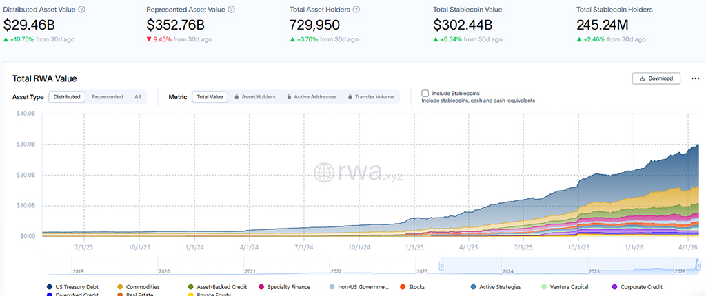 Согласно данным rwa.xyz, стоимость токенизированных реальных активов в публичных блокчейнах в 2026 году неуклонно росла и сейчас превышает $29 миллиардов, увеличившись более чем на 10% за последние 30 дней.