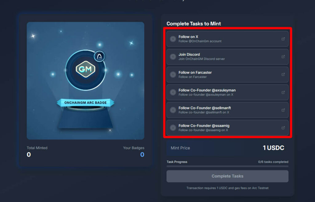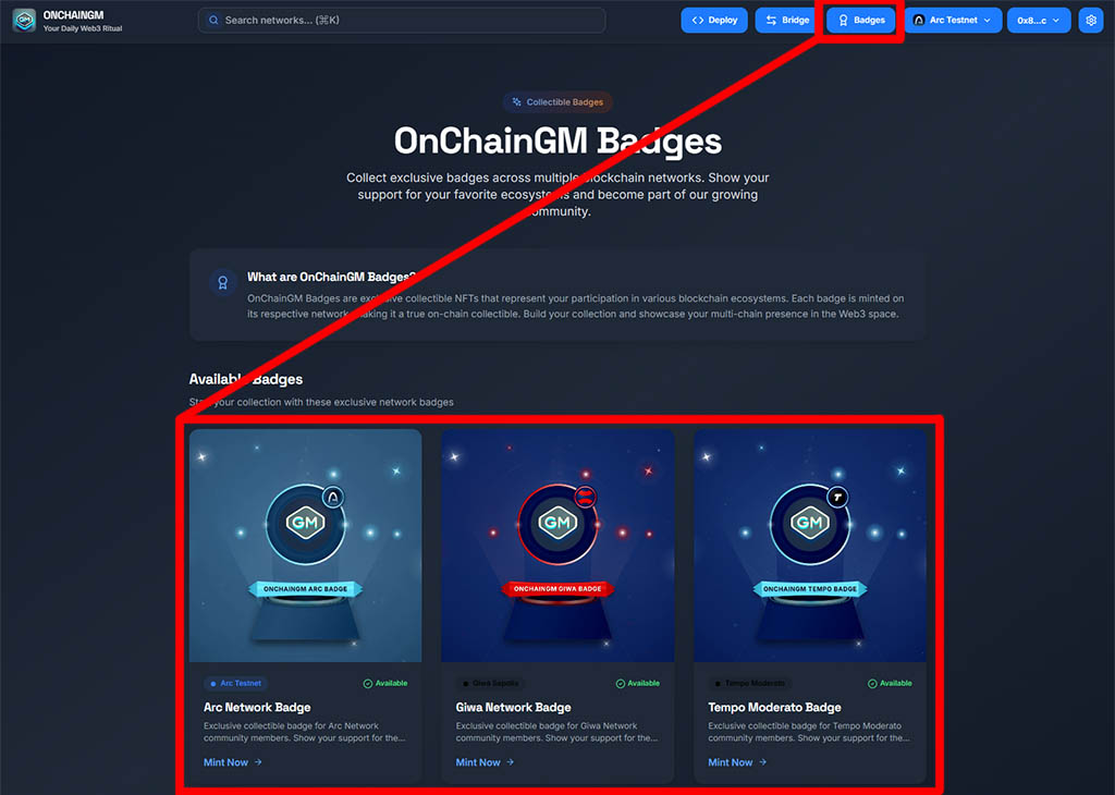 Мультичейн-платформа OnchainGM, специализирующаяся на ончейн-взаимодействии выпустила бейджи в тестовых сетях Arc, GIWA и Tempo. Чеканка этих бейджей бесплатна и позволяет пользователю увеличить свою активность в тестнетах.