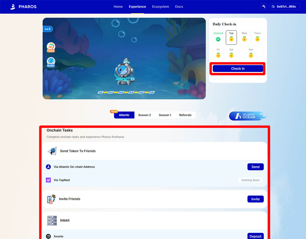 Задания Atlantic:Daily Check-In - заходите на страницу и нажимайте кнопку "Check-In" ежедневно.