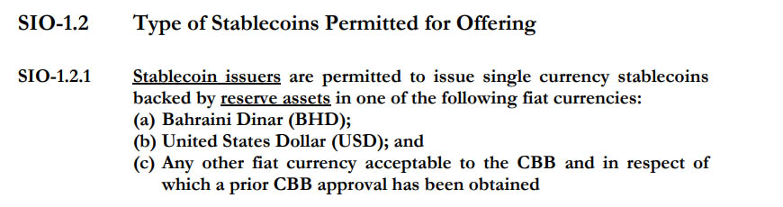 «Согласно новому регулированию стейблкоинов, лицензированным эмитентам стейблкоинов разрешено выпускать одновалютные стейблкоины, обеспеченные бахрейнским динаром (BHD), долларом США (USD) или любой другой фиатной валютой, приемлемой Центробанком Бахрейна», — говорится в официальном заявлении ЦББ от 4 июля.