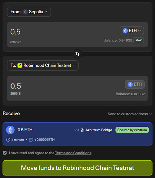 2. Отправьте немного ETH из сети Ethereum Sepolia в сеть Robinhood Chain Testnet при помощи моста Arbitrum Bridge: