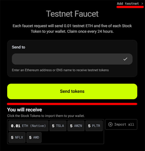 1. Перейдите на страницу Robinhood Chain Testnet Faucet, подключите кошелек и получите тестовые токены ETH, TSLA, AMZN, PLTR, NFLX и AMD: