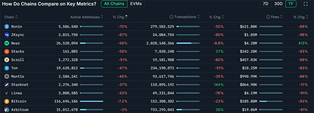 Согласно данным аналитической платформы Nansen, активность в нескольких крупных блокчейн-сетях резко снизилась: за последний год в 11 блокчейнах наблюдалось падение числа активных адресов. Наибольшее падение показал Ronin — на 70%, в то время как Bitcoin снизился на 7,2%. В список также вошли несколько сетей второго уровня Ethereum. Данные Nansen также показали снижение активности транзакций во многих из этих же сетей. В сети ZKsync зафиксировано одно из самых резких падений: количество транзакций сократилось на 90%.