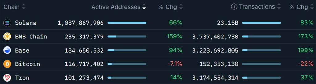 Solana зафиксировала наибольшее количество активных адресов в отрасли — более 1 миллиарда, за ней следуют Tron и Ethereum. BNB Chain показала рост числа активных адресов на 159%, в то время как Bitcoin был единственной сетью из первой пятерки, зафиксировавшей снижение, а также падение количества транзакций на 22%.