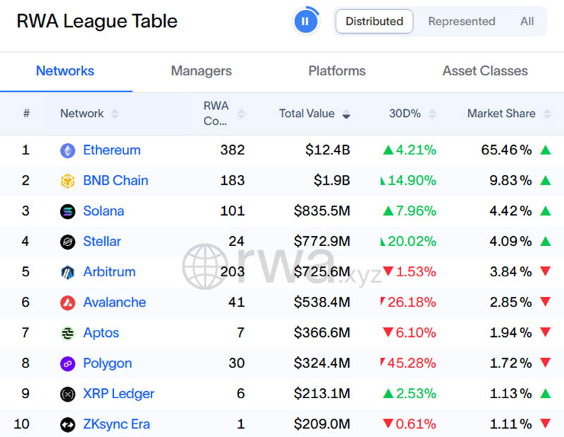 До 2025 года этот рынок оставался сконцентрированным вокруг небольшой группы крупных эмитентов и инструментов на Ethereum, в то время как данные RWA.xyz показывают наличие второго уровня сетей, включая BNB Chain, Avalanche, Solana, Polygon и Arbitrum, каждая из которых занимает от нескольких процентов в общей стоимости реальных активов (RWA) в публичных блокчейнах.