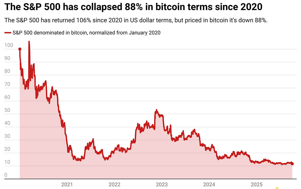 В сообщении от 5 октября Фил Розен, соучредитель информационного бюллетеня Opening Bell Daily, посвященного фондовому рынку, отметил, что хотя с 2020 года индекс S&P 500 вырос на 106% в долларовом эквиваленте, в BTC он существенно «обвалился», что вызвало восторженные отзывы у экспертов по биткоину.