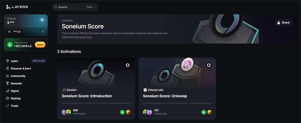 1. Перейдите на страницу кампании Soneium Score на платформе Layer3: