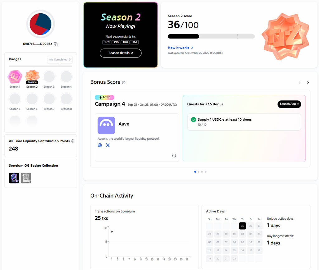 ➤ Выполнение сезонных заданий, представленных в Soneium Score.