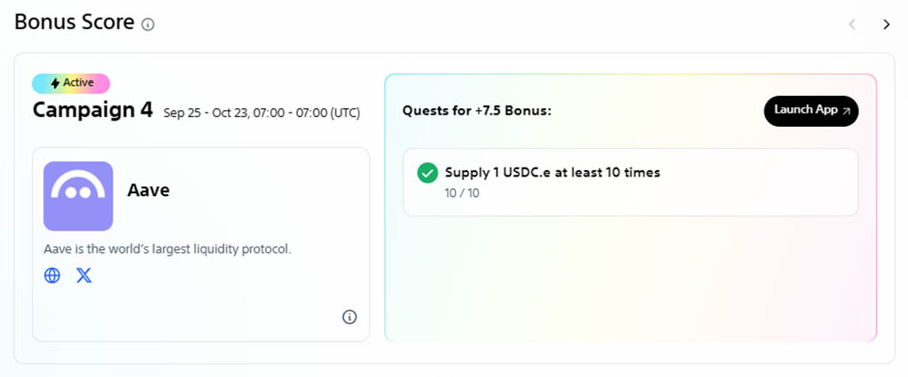 ➤ Депонируйте 10 раз не менее 1 USDC.e на платформе Aave (+7,5 баллов).