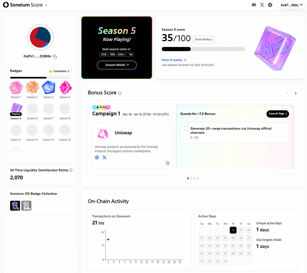 ➤ Выполнение сезонных заданий, представленных в Soneium Score.