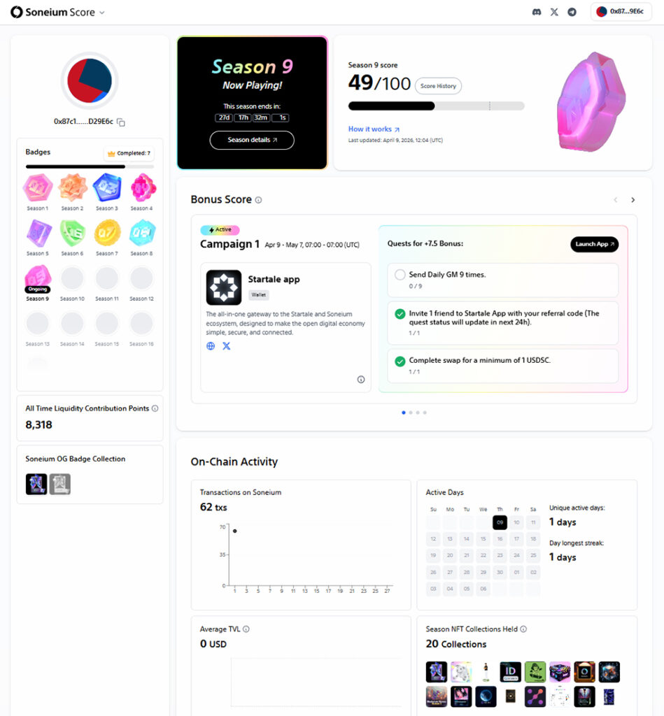 Сеть второго уровня Soneium объявила о начале 9 сезона на официальной платформе подтверждения вклада Soneium Score. Платформа отображает репутацию кошельков и содержит квесты, которые позволяют зарабатывать баллы подтверждающие участие пользователей. Выполняя задания, пользователи могут накапливать свою репутацию и получать сезонные NFT достигнув 80-100 баллов. Так как эта активность официальная, то с большой долей вероятности, полученные NFT будут влиять на аирдроп собственных токенов Soneium.