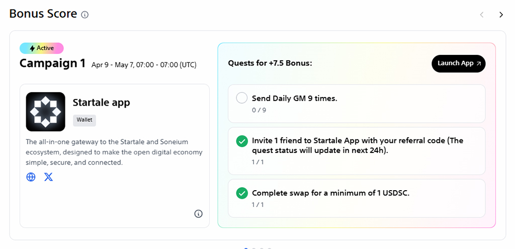 ➤ Сделайте 9 GM в приложении Startale, пригласите одного реферала и совершите своп на сумму 1 USDSC.