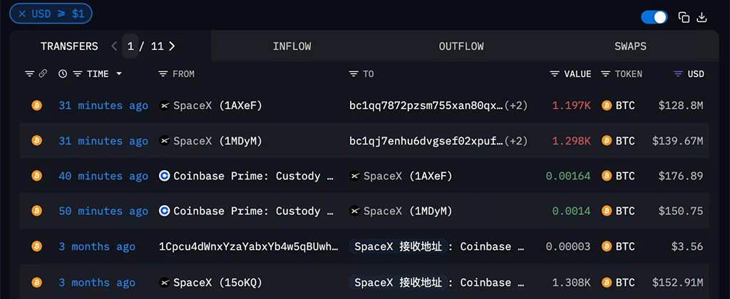 Мониторинг сети показал, что компания SpaceX недавно перевела 2395 BTC (на сумму $286 млн.) на два немаркированных адреса после трех месяцев отсутствия активности в сети.