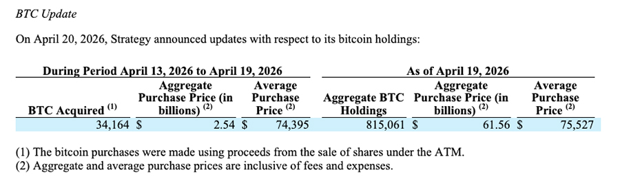 Согласно отчету по форме 8-K, поданному в Комиссию по ценным бумагам и биржам США (SEC) в понедельник, компания Strategy приобрела 34164 BTC на сумму $2,54 миллиарда в период с 13 по 19 апреля.