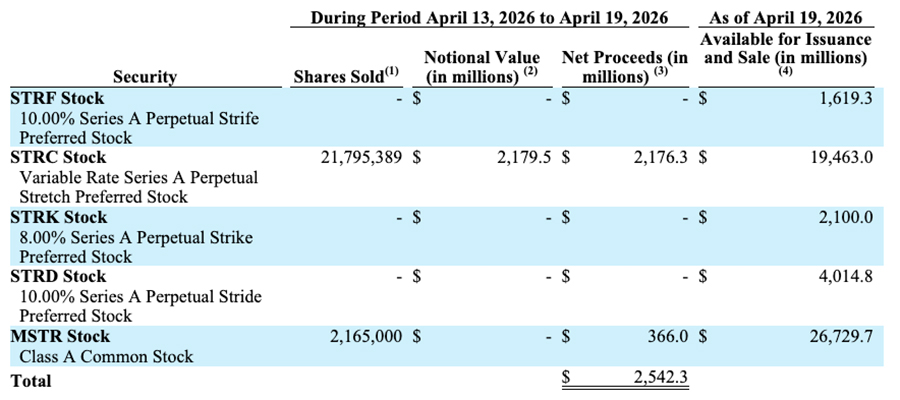 13 апреля STRC установила новый оценочный дневной рекорд, составивший около 7741 BTC, на основе продажи 11,9 миллионов акций через свою программу торговли на рынке (ATM), что, по данным STRC Live, привело к объему торгов более $1 миллиарда.