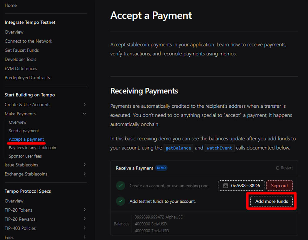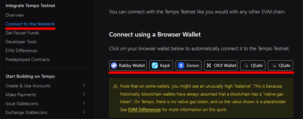 1. Подключите кошелек и добавьте тестовую сеть Tempo Testnet на странице Connect to the Network: